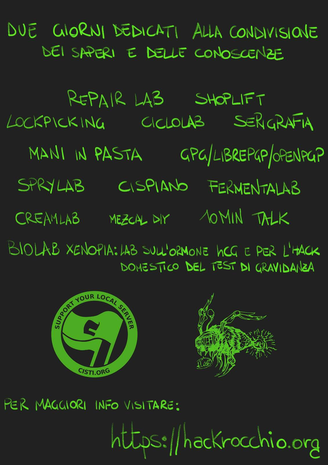 Per quanto instabili i nostri hackrocchi funzionano! Ci crederete? Riusciamo a stamparli, a crearli e a distribuirli perche' crediamo nell'autogestione sui nostri corpi, sulla tecnologia che ci circonda e crediamo che tutto parta dalla condivisione. Questo mondo non ci fa paura e lo vogliamo hackerare!